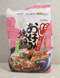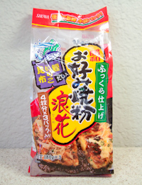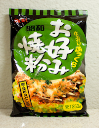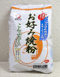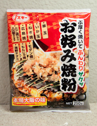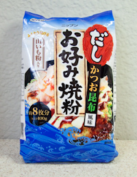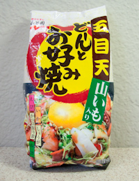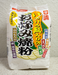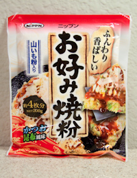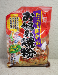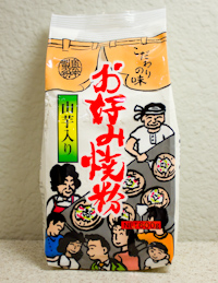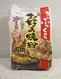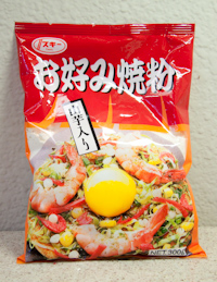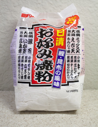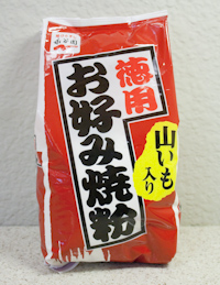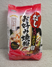 There are a wide variety of Okonomiyaki flours available. Each has a different level and type of seasoning. Below are a few pictures of the various packaging - all of these are exported from Japan to US and other countries. The most traditional preparation would not even use Okonomiyaki flour at all, but would take regular wheat flour and add fresh grated Nagaimo or Yamaimo (Japanese mountain yam) to get the sticky glutinous texture that holds everything together. These modern flours incorporate yam flour in their mix along with other seasonings, usually shrimp and scallop but also bonito and sometimes MSG. You can purchase Okonomiyaki Flour or a complete Okonomiyaki Kit in the Shop area.